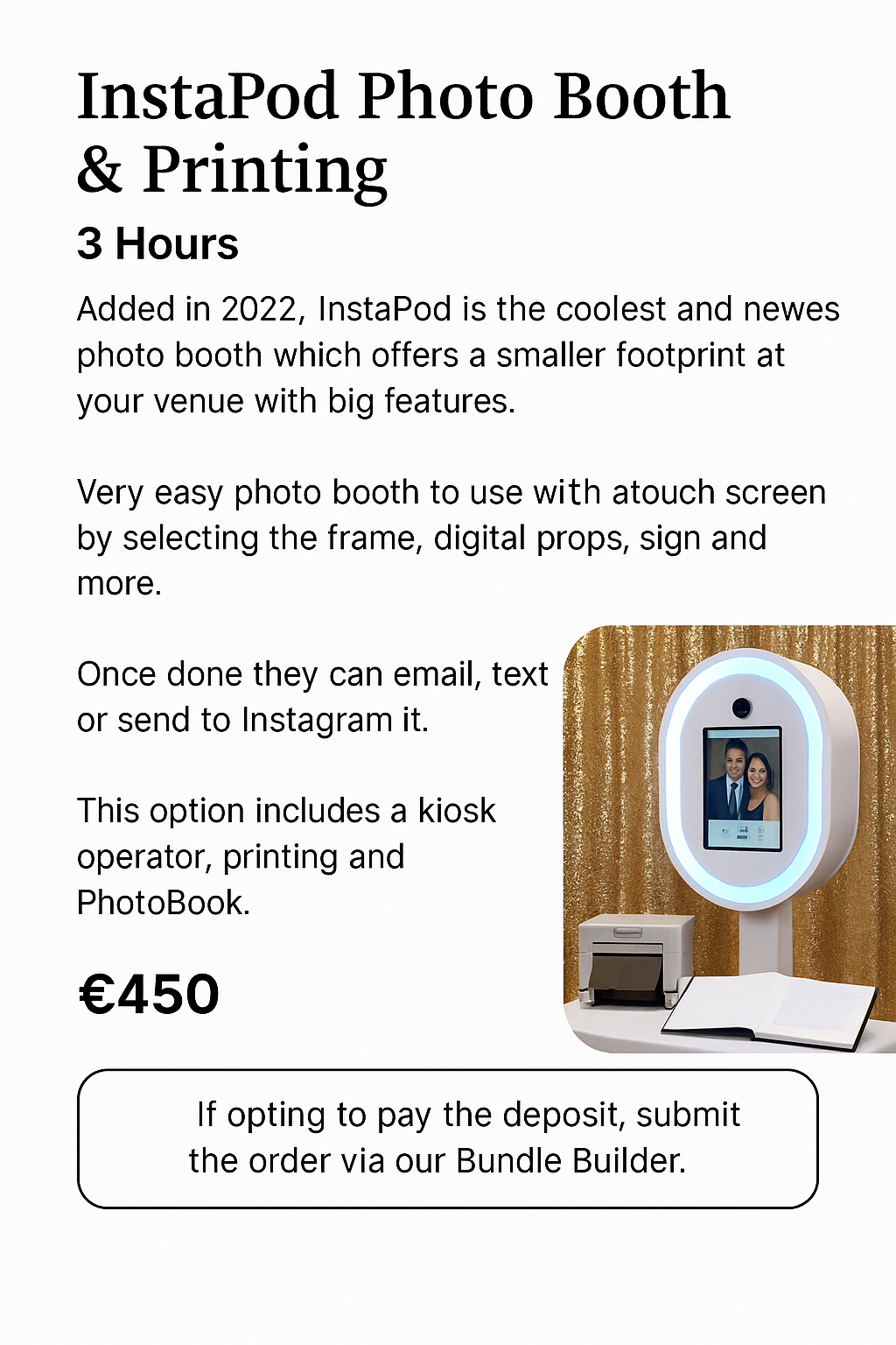 - Includes kiosk operator, printing, and a PhotoBook keepsake.