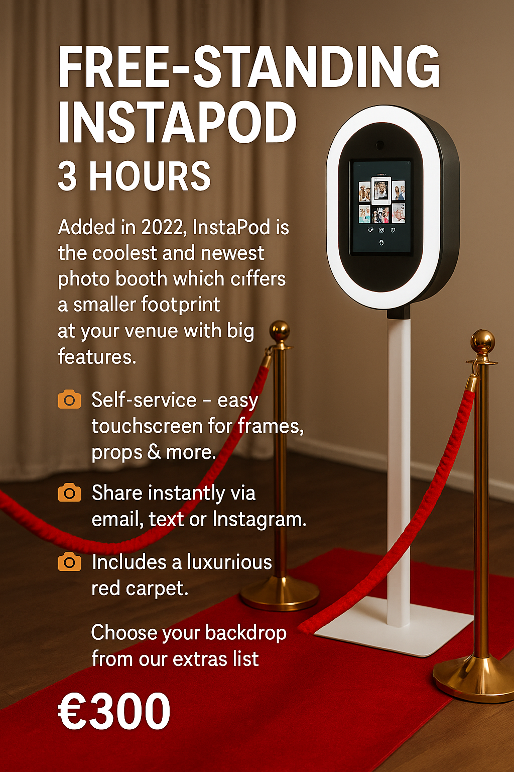 Added in 2022, InstaPod is our coolest and newest photo booth! With its sleek design and small footprint, it fits perfectly in any venue while delivering big features.